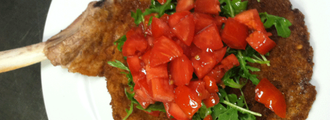 Jidori natural breaded chicken breast topped with mozzarella and prosciutto.
